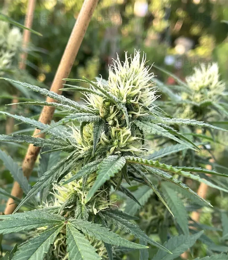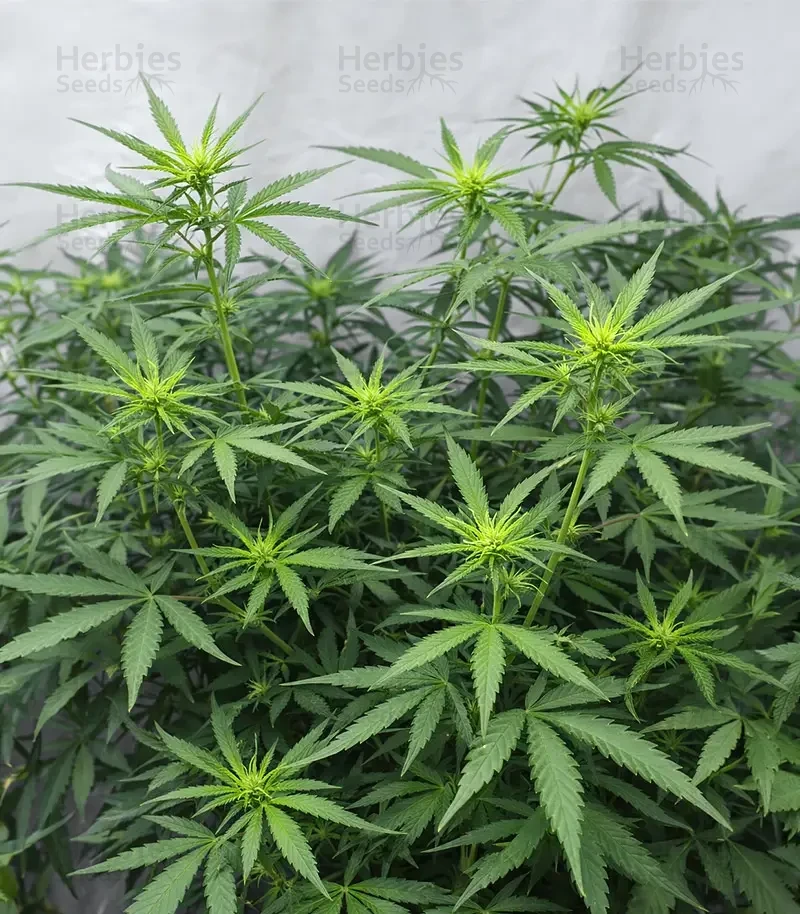 With the structure of a typical Sativa with thin leaflets and stems but when in bloom it shows accelerated growth of dense and heavy flower clusters. large specimens require pruning of surplus branches.